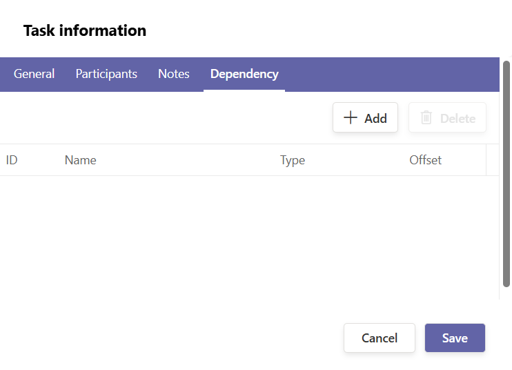 - Open Task B β Dependencies β select Task A and the relation type.