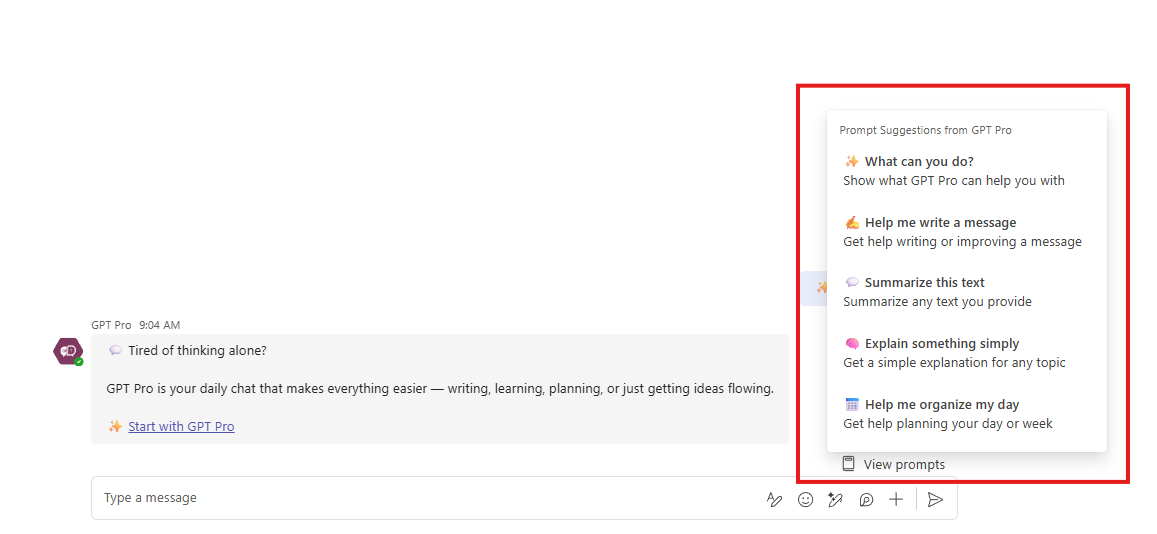 GPT Pro includes a suggestion panel displayed at the bottom of the chat window, offering one-click access to common tasks.