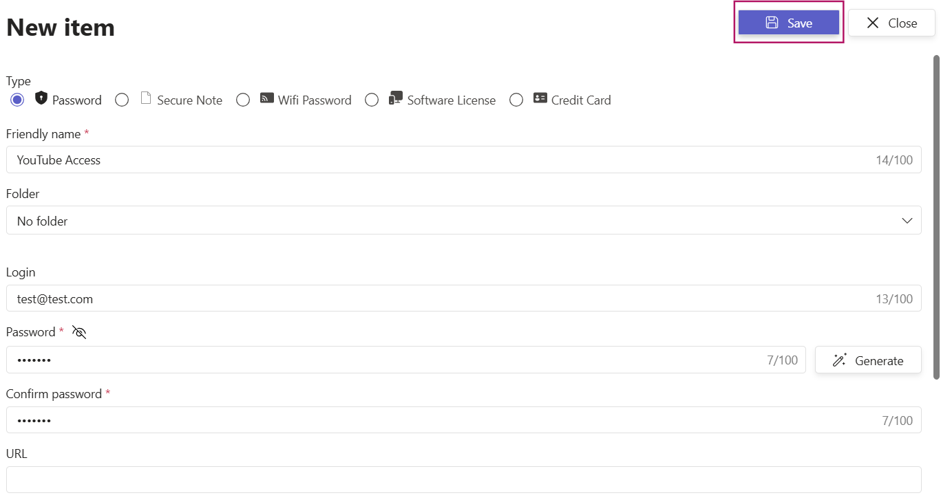 - Enter all relevant details you want to store (e.g., title, username, password, URL, notes).